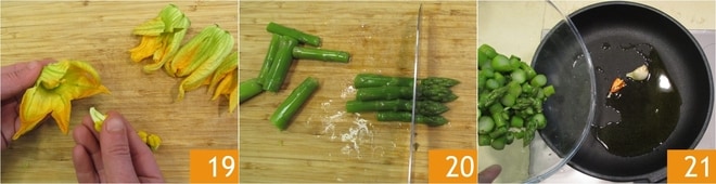 In der Zwischenzeit entfernen Sie den Stempel aus den Zucchiniblüten 19. Schneiden Sie den Spargel in Ringe 20 und braten Sie ihn für ein paar Minuten in einer Pfanne an, in der Sie eine zerdrückte Knoblauchzehe in der Schale und eine halbierte Chilischote in etwas Öl angedünstet haben 21.