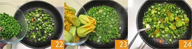 Fügen Sie die Erbsen 22 und die Zucchiniblüten 23 hinzu, salzen und pfeffern Sie und braten Sie alles für ein paar Minuten an. Sobald sie gekocht sind, entfernen Sie den Knoblauch 24 und die Chilischote und lassen Sie sie abkühlen.