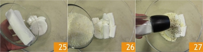 In der Zwischenzeit mischen Sie in einer Schüssel die Ricotta, den Ziegenkäse 25 und den geriebenen Parmigiano Reggiano DOP 26, salzen 27 und pfeffern Sie.