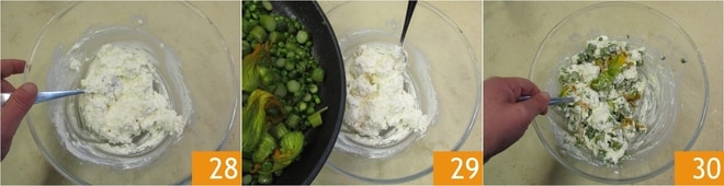 Vermengen Sie alles 28, dann fügen Sie das abgekühlte Gemüse hinzu 29 und mischen Sie gut, um eine homogene Mischung zu erhalten 30.