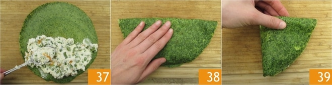 Sie sind bereit, die Crespelle zu füllen: Legen Sie eine Crêpe auf die Arbeitsfläche, verteilen Sie die Füllung auf der Hälfte der Oberfläche 37 und falten Sie sie in zwei 38, dann falten Sie sie weiter, um ein Dreieck zu erhalten 39. Fahren Sie auf diese Weise fort, um alle Crespelle, sowohl weiße als auch grüne, zu füllen.