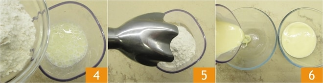 Fügen Sie auch das gesiebte Mehl hinzu 4 und emulgieren Sie es mit einem Stabmixer 5, um eine glatte und homogene Konsistenz zu erhalten. Teilen Sie den erhaltenen Teig in 2 Schüsseln auf 6.