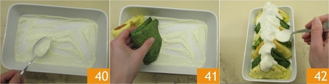 Bestreuen Sie nun den Boden einer Auflaufform mit etwas Bechamelsoße 40, legen Sie dann die gefüllten Crespelle mit der Spitze nach oben und wechseln Sie die Farben ab 41 und bedecken Sie sie mit dem Rest der Bechamelsoße 42.