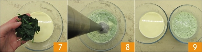 In eine der beiden Schüsseln geben Sie den bereits gekochten und ausgedrückten Spinat 7 und mixen Sie ihn mit dem Stabmixer, um ihn zu integrieren 8. Wenn beide Mischungen fertig sind, fahren Sie mit dem Kochen fort 9.
