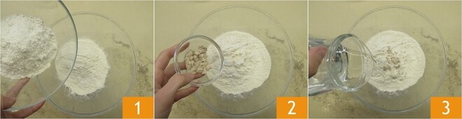 Um die Frühlingsfocaccia vorzubereiten, beginnt mit dem Teig. In einer Schüssel mischt das Mehl 1, die zerbröselte Hefe 2 und das gesamte Wasser 3.
