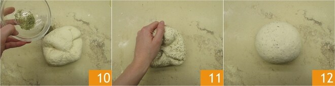 Fügt auch die 3 getrockneten Kräuter hinzu 10 und knetet etwa 5 Minuten weiter 11, oder bis der Teig glatt und homogen ist 12.