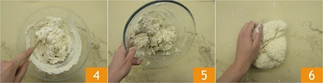 Beginnt mit einem Löffel zu mischen 4, und sobald das Wasser aufgenommen ist, übertragt den Teig auf die Arbeitsfläche 5 und knetet kräftig, bis er homogen ist 6.