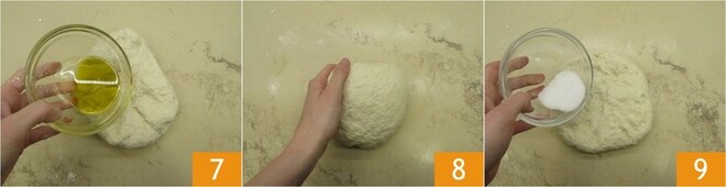 Fügt an dieser Stelle das Öl in drei Teilen hinzu 7, wobei ihr den nächsten Teil erst dann hinzufügt, wenn die vorherige Menge vom Teig aufgenommen wurde. Sobald das gesamte Öl aufgenommen ist 8, fügt das Salz hinzu 9 und knetet, bis es gut eingearbeitet ist.