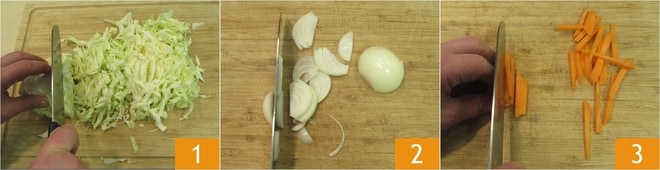 Um die Frühlingsrollen zuzubereiten, tauen Sie zuerst die bereits fertigen Blätter auf und bedecken Sie sie mit einem leicht feuchten Tuch, um zu verhindern, dass sie austrocknen. Schälen und schneiden Sie den Spitzkohl 1, die Zwiebeln 2 und die Karotten 3 in dünne Streifen.