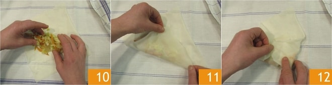 An diesem Punkt können Sie die Rollen zusammenstellen: Legen Sie ein Blatt nach dem anderen auf das Tuch, mit einer Ecke zu Ihnen hin, und fügen Sie eine Handvoll Füllung auf die untere Hälfte 10 hinzu. Falten Sie die untere Ecke nach oben und rollen Sie, ohne zu drücken, um die Füllung zu bedecken 11, dann falten Sie die Seitenwinkel zur Mitte 12.