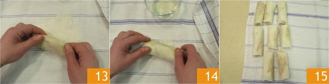 Rollen Sie schließlich die Rolle von unten nach oben 13 und versiegeln Sie das Blatt, indem Sie die Ränder mit etwas Eiweiß anfeuchten 14; Sie können Ihre Finger oder einen Pinsel verwenden. Drücken Sie nicht zu stark, sonst könnte das Blatt reißen. Verfahren Sie auf diese Weise, um alle Rollen zu formen 15.