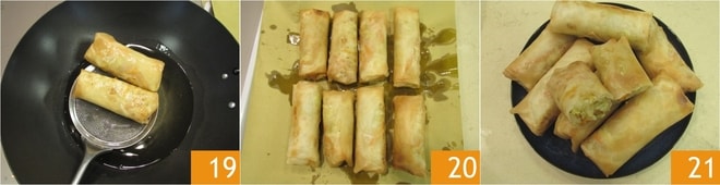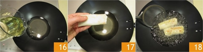Erhitzen Sie den Wok erneut, geben Sie dann reichlich Pflanzenöl 16 hinein, um es auf 180°C zu bringen. Wenn das Öl die Temperatur erreicht hat, reduzieren Sie die Hitze leicht und frittieren Sie wenige Rollen auf einmal 17, indem Sie sie auf beiden Seiten wenden 18.