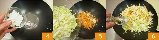 Erhitzen Sie den Wok auf hoher Flamme, geben Sie dann das Pflanzenöl und die Zwiebeln 4 hinein. Braten Sie sie für ein paar Minuten an, fügen Sie dann die Karotten und den Spitzkohl hinzu 5. Würzen Sie mit Salz und Pfeffer 6.