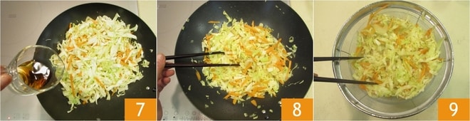Fügen Sie auch den Reiswein 7 hinzu und braten Sie das Gemüse für 4-5 Minuten an: Es sollte gekocht, aber noch knackig sein 8. Geben Sie das Gemüse in ein Sieb, um die überschüssige Flüssigkeit zu entfernen, und breiten Sie es dann mit Stäbchen etwas aus, um die Farbe und Konsistenz besser zu bewahren 9.