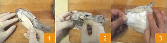 Um die Fusilli mit Miesmuscheln und kleinen Tintenfischen zuzubereiten, beginnt mit der Wie man Tintenfische säubert. Schneidet den Bauch des Tintenfisches auf und entfernt den Knochen 1. Nach dem vorsichtigen Öffnen der Hälfte entfernt, falls vorhanden, den Sack mit der Tinte 2. Trennt den Kopf vom Körper, indem ihr die beiden Teile leicht in entgegengesetzte Richtungen zieht. Nach dem Einschneiden des Körpers entfernt die Haut 3.