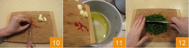 Nehmt dann die Chilischote, öffnet sie der Länge nach und entfernt die Samen, dann schneidet sie in dünne Streifen 7. Gebt sie mit einer in Stücke geschnittenen Knoblauchzehe in einen Topf mit einem Schuss Öl 8. Bratet, bis der Knoblauch eine goldene Farbe angenommen hat. Hackt die Petersilie fein 9. Behaltet ein wenig davon für die Würzung und Dekoration des Gerichts zurück.