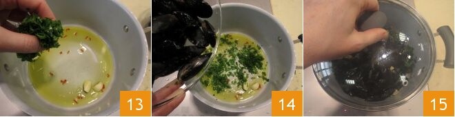 Fügt die restliche Petersilie in den Topf 10 zusammen mit den Miesmuscheln 11 hinzu. Lasst es einige Minuten bei starker Hitze mit Deckel kochen 12.