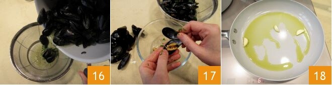 Wenn sich die Miesmuscheln öffnen, schaltet das Feuer aus und gießt sie mit einem feinen Sieb in eine Schüssel, um das beim Kochen freigesetzte Wasser zu filtern 13. Bewahrt die Flüssigkeit auf und schält die Miesmuscheln 14, lasst einige ganz für die Dekoration des Gerichts. Nehmt nun eine Antihaftpfanne mit großem Boden und bratet eine Knoblauchzehe an 15. Wenn ihr möchtet, könnt ihr ihn zerdrücken.
