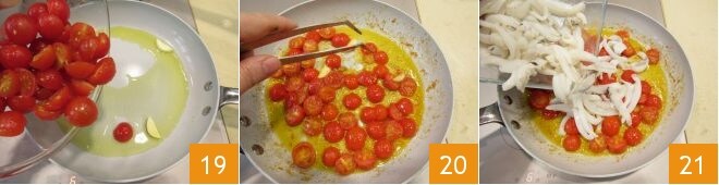 Gebt die gewaschenen und halbierten Kirschtomaten hinzu 16. Lasst sie 10 Minuten bei mittlerer Hitze in der Pfanne kochen. Entfernt dann den Knoblauch 17 und fügt die kleinen Tintenfische hinzu 18. Lasst es weitere 5 Minuten kochen.