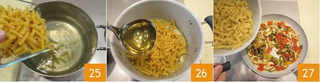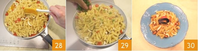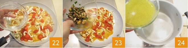Dann die Fusilli hineingeben 22: Diese müssen von der Kochflüssigkeit der Miesmuscheln knapp bedeckt sein, die ihr nach und nach hinzufügen könnt 23: Wenn die Kochflüssigkeit der Miesmuscheln nicht ausreicht, verwendet heißes Wasser oder leichte Gemüsebrühe. Rührt ständig um, um ein Anhaften der Pasta zu verhindern. Zwei Minuten vor Ende der Kochzeit die Fusilli in die Pfanne mit dem Miesmuschel- und Tintenfischbelag geben 24.