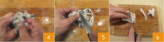 Nehmt dann den Kopf des Tintenfisches und entfernt den Schnabel (den Zahn) 4: Ihr könnt leichten Druck mit den Fingern unter dem Schnabel ausüben, um ihn zu finden und nach oben zu drücken. Schneidet um die Augen des Tintenfisches herum und entfernt sie 5. Spült die Tintenfische unter fließendem Wasser. Schneidet nun vom Körper des Tintenfisches Streifen in Längsrichtung ab 6 und zerkleinert die Tentakel in kleine Stücke. Beiseite stellen.
