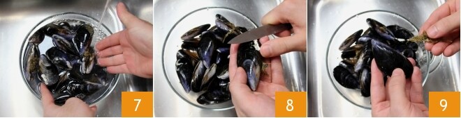 Fahrt fort mit der Wie man Miesmuscheln reinigt und öffnet. Spült die Miesmuscheln unter fließendem Wasser ab 7. Entfernt mit der Klinge eines Messers (oder mit einem Stahlschwamm) Verkrustungen und Unreinheiten von der Schale 8 und entfernt dann den Bart 9. Spült sie erneut mit frischem Wasser ab. Beiseite stellen.