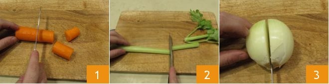 Um die Galantine vom Perlhuhn zuzubereiten, bereiten Sie zuerst die Gemüsebrühe zu: Schälen Sie die Karotte und schneiden Sie sie in grobe Stücke 1, waschen und schneiden Sie den Sellerie auf die gleiche Weise 2 und zum Schluss schälen Sie die Zwiebel und vierteln sie 3.