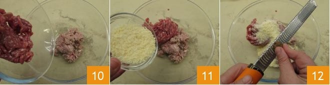 In einer Schüssel geben Sie das Schweinehackfleisch, das Kalbfleisch 10 und den geriebenen Käse 11 dazu, würzen Sie mit geriebener Muskatnuss 12