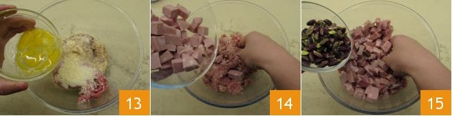 und fügen Sie das Ei hinzu 13. Beginnen Sie mit dem Mischen der Zutaten und zum Schluss mischen Sie auch die Mortadella, die Zunge 14 und die Pistazien unter 15.