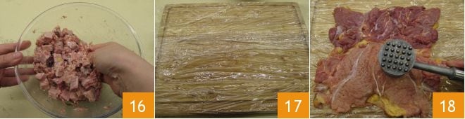 Mischen Sie erneut, um diese letzten Zutaten einzuarbeiten 16. Jetzt legen Sie ein Blatt Frischhaltefolie auf ein Schneidebrett 17 und breiten darauf das entbeinte Perlhuhn aus, indem Sie es wie ein Buch aufklappen. Klopfen Sie es leicht mit einem Fleischklopfer flach 18,