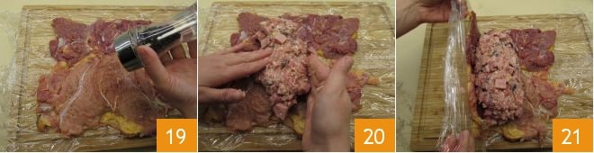 salzen und pfeffern Sie dann 19 und legen Sie die zuvor vorbereitete Füllung in die Mitte und drücken Sie sie mit den Händen zu einer Wurstform 20. Heben Sie nun die Frischhaltefolie auf einer Seite an und verwenden Sie sie, um das Perlhuhn aufzurollen 21.