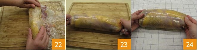 Sobald die Rolle geformt ist 22, drehen Sie die Enden der Frischhaltefolie, um die Form zu halten 23 und legen Sie die entstandene Wurst auf ein sauberes Küchentuch 24.