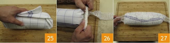 Rollen Sie das Küchentuch um die Rolle 25, stecken Sie es dann in ein Bratennetz, damit es schön kompakt bleibt (26-27). Wenn Sie kein Bratennetz haben, können Sie Küchengarn verwenden.