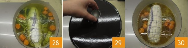 Tauchen Sie nun die so eingewickelte Rolle in die Brühe 28, salzen Sie und decken Sie mit dem Deckel ab 29, lassen Sie sie dann 3 Stunden lang auf kleiner Flamme köcheln. Drehen Sie das Perlhuhn während des Kochens einmal um und stellen Sie sicher, dass es immer von der Brühe bedeckt ist. Nach den 3 Stunden 30 nehmen Sie die Rolle aus der Brühe und lassen Sie sie bei Raumtemperatur abkühlen, danach stellen Sie sie für mindestens 12 Stunden in den Kühlschrank.