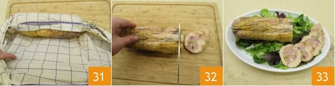 Nach den 12 Stunden entfernen Sie das Netz, das Küchentuch 31 und die Frischhaltefolie. Schneiden Sie die Galantine vom Perlhuhn in Scheiben 32 und servieren Sie sie bei Zimmertemperatur auf einem Bett aus frischem Salat 33.