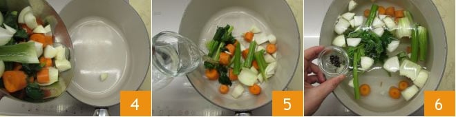 Geben Sie in einen großen Topf das Gemüse 4, fügen Sie das Wasser 5 und die Pfefferkörner 6 hinzu. Bringen Sie es zum Kochen und lassen Sie es für die Zeit der Zubereitung des Rezepts auf dem Feuer.