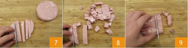 Schneiden Sie die Mortadellascheibe in Streifen 7 und dann in Würfel 8. Machen Sie dasselbe mit der Zunge 9.