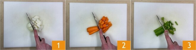 Um die Garnelen im Speckmantel zuzubereiten, schälen Sie die Karotte und schneiden Sie sie grob 1, machen Sie dasselbe mit der Karotte 2 und dem Sellerie 3.