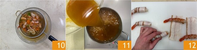 Nach dem Kochen filtern Sie die Brühe 10, bringen Sie sie wieder zum Kochen 11 und lassen Sie sie einkochen, das dauert etwa 20-30 Minuten. Legen Sie die Speckscheiben auf ein Brett, legen Sie die Garnele an ein Ende und wickeln Sie sie in den Speck 12. Machen Sie das mit allen so.