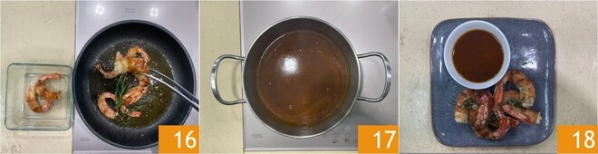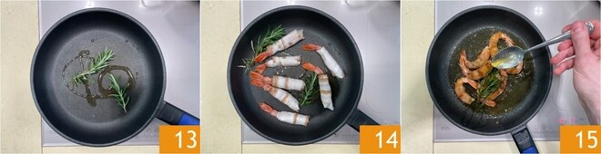 In einer beschichteten Pfanne erhitzen Sie einen Schuss Öl, würzen Sie mit einem Zweig Rosmarin 13 und legen Sie die Garnelen hinein 14. Braten Sie sie bei hoher Hitze von beiden Seiten, bis sie goldbraun sind, und begießen Sie die Garnelen dabei nach und nach mit dem Bratensaft 15.