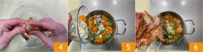 Reinigen Sie die Garnelen, entfernen Sie den Kopf und das Darm mit einem Zahnstocher 4. Die Panzer werden für die Zubereitung der Brühe benötigt: In einem Topf erhitzen Sie einen Schuss Öl, fügen Sie das Gemüse 5 und die Panzer 6 hinzu.