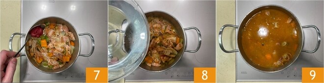 Würzen Sie mit Tomatenmark 7 und rösten Sie alles kurz an, dann geben Sie so viel Wasser hinzu, dass alles bedeckt ist 8 und kochen Sie es 30 Minuten lang 9.