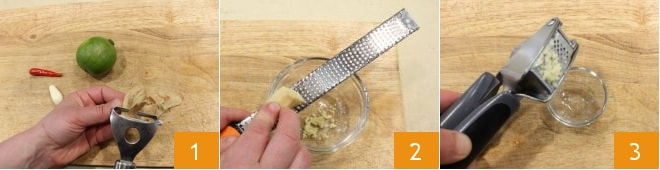 Um die mit Honig gebratenen Garnelen zuzubereiten, schälen und reiben Sie den frischen Ingwer (1-2), zerdrücken Sie eine Knoblauchzehe 3,