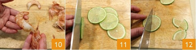 In der Zwischenzeit säubern Sie die Garnelen: Entfernen Sie den Kopf und die Beine, entfernen Sie den Panzer 10 und ziehen Sie mit einem Zahnstocher den Darm heraus. Schneiden Sie die andere Limette in sehr dünne Scheiben 11 und schneiden Sie jede in 4 Stücke 12