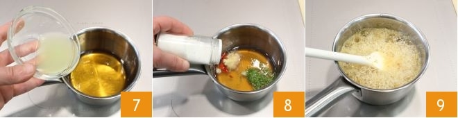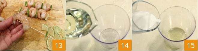 stellen Sie die Spieße zusammen: Stecken Sie 3 Garnelen auf einen Holzspieß 13 und wechseln Sie sie mit einer Limettenscheibe ab. Legen Sie sie beiseite und bereiten Sie inzwischen die falsche Mayonnaise vor: Gießen Sie in eine schmale und hohe Schüssel das Pflanzenöl 14, die Milch 15,