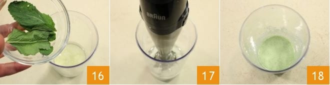 fügen Sie einen Teelöffel Limettensaft und die Minzblätter hinzu 16. Salzen, pfeffern und mixen Sie mit dem Stabmixer 18, bis Sie eine glatte Creme erhalten 18.