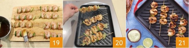 Nun können Sie mit dem Garen beginnen, bestreichen Sie die Spieße mit der Honigsauce 19 und braten Sie sie dann auf einem gut erhitzten Grill auf beiden Seiten für ein paar Minuten 20. Servieren Sie die mit Honig gebratenen Spieße zusammen mit der Minz-Mayonnaise 21.
