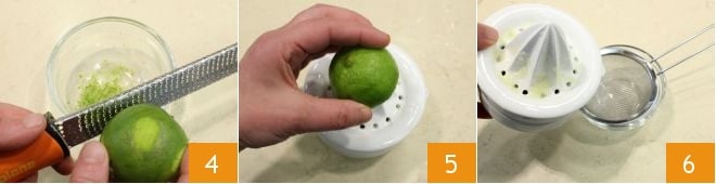 reiben Sie die Schale einer Limette ab 4 und pressen Sie den Saft aus 5, dann filtern Sie ihn durch ein Sieb 6.