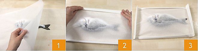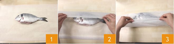 GESCHENKPAKET-FOLIE Die Geschenkpaket-Folie ist die einfachste zu erstellen und kann zum Beispiel zum Garen ganzer Fische, wie zum Beispiel einer Goldbrasse oder einem Wolfsbarsch, verwendet werden. Um diese Art von Folie zu erstellen, schneiden Sie ein Rechteck aus Backpapier, das länger und breiter ist als der Fisch, den Sie zubereiten möchten, legen Sie dann die Goldbrasse in die Mitte des Blattes 1 und falten Sie die langen Seiten des Backpapiers über das Lebensmittel 2 und überlappen sie 3,