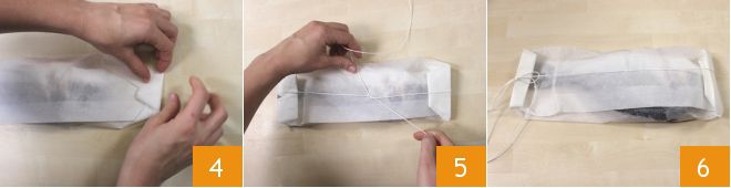 verschließen Sie dann alles, indem Sie die kurzen Seiten nach innen falten, als ob Sie ein Geschenkpaket schließen würden 4. Befestigen Sie das Paket, indem Sie den längeren Teil mit festem Küchengarn binden 5 und mit einer Schleife 6 beenden, so wird die Folie perfekt halten!
